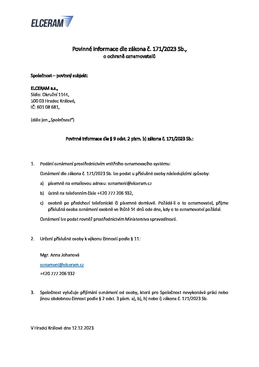 Ke stažení Technologie TPC Informace dle zákona č. 171/2023 Sb. Technické podmínky výroby potištěných substrátů v ELCERAM a.s. CPV (Concentrated Photovoltaics) - Vývoj fotovoltaických panelů nové generace v Elceram a TTS Zapouzdřený vysoce účinný solární článek CPV Porovnávání SI a CPV solárních panelů